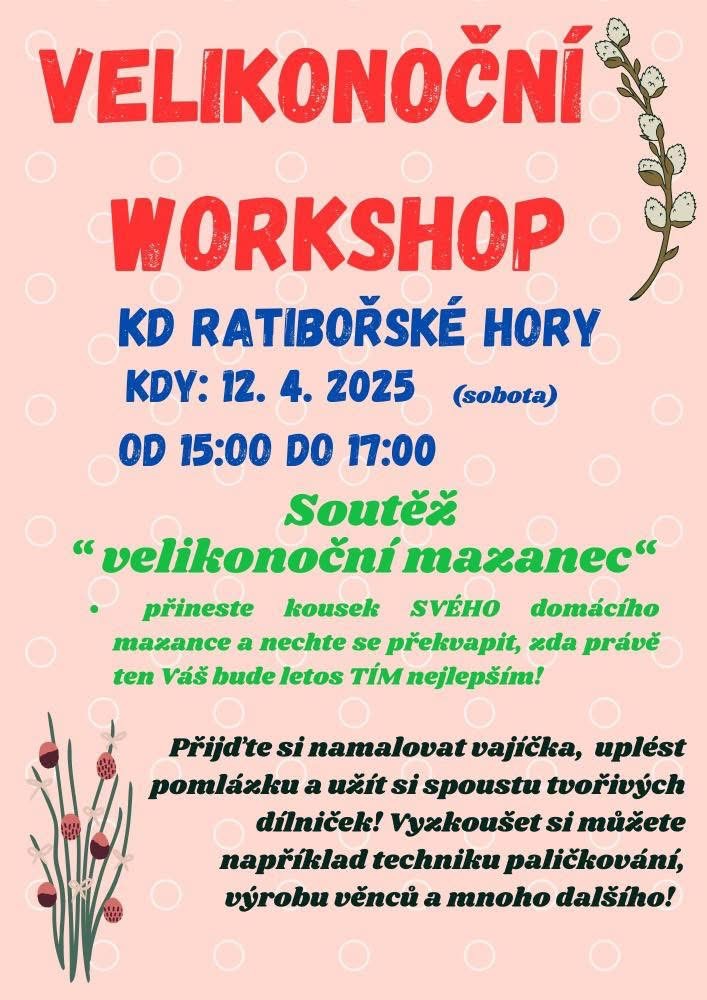V sobotu 12.4.2025 bude v KD Ratibořské Hory od 15 hod. probíhat velikonoční workshop. Přijďte se zapojit do soutěže o nejlepší velikonoční mazanec, uplést pomlázku nebo vyzkoušet techniku paličkování.